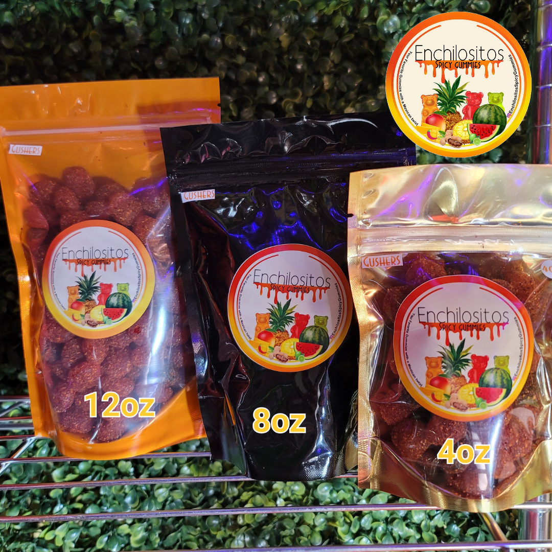 Spicy Gummy bears covered in our signature chamoy and our special chile mix.